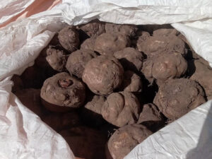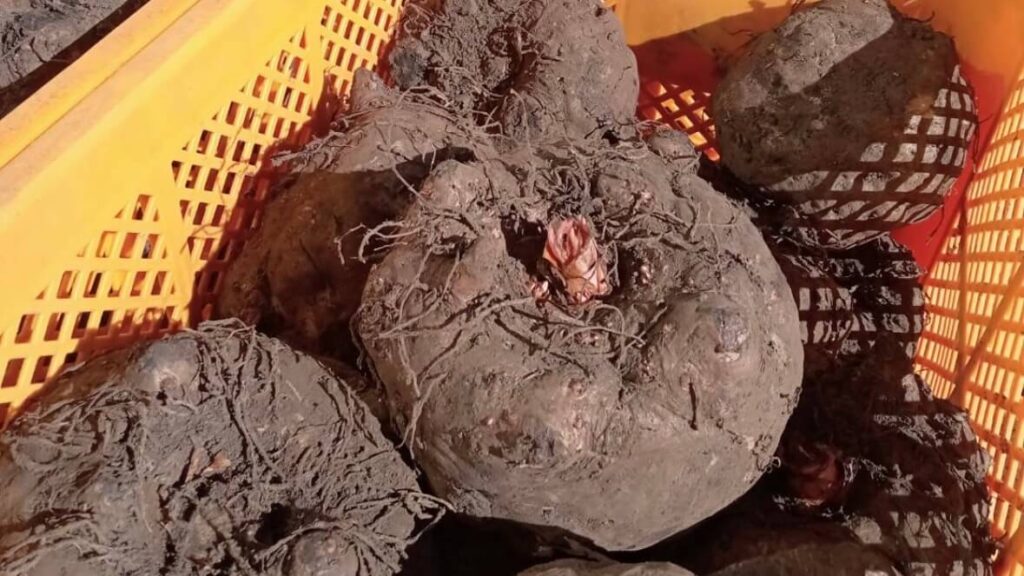 夏の間に大きく育ったこんにゃく芋は、青々とした葉が徐々に枯れていき、完全に枯れた11月頃に収穫期を迎えます。